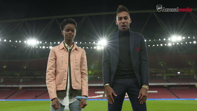 The Gabon and Arsenal striker teamed up with Black Panther star Letitia Wright on Monday